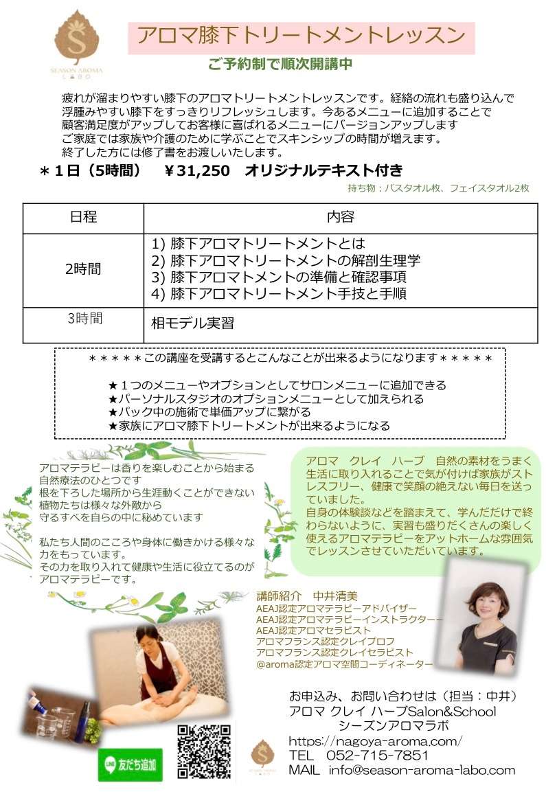 「アロマ膝下トリートメント」講座のお知らせです。