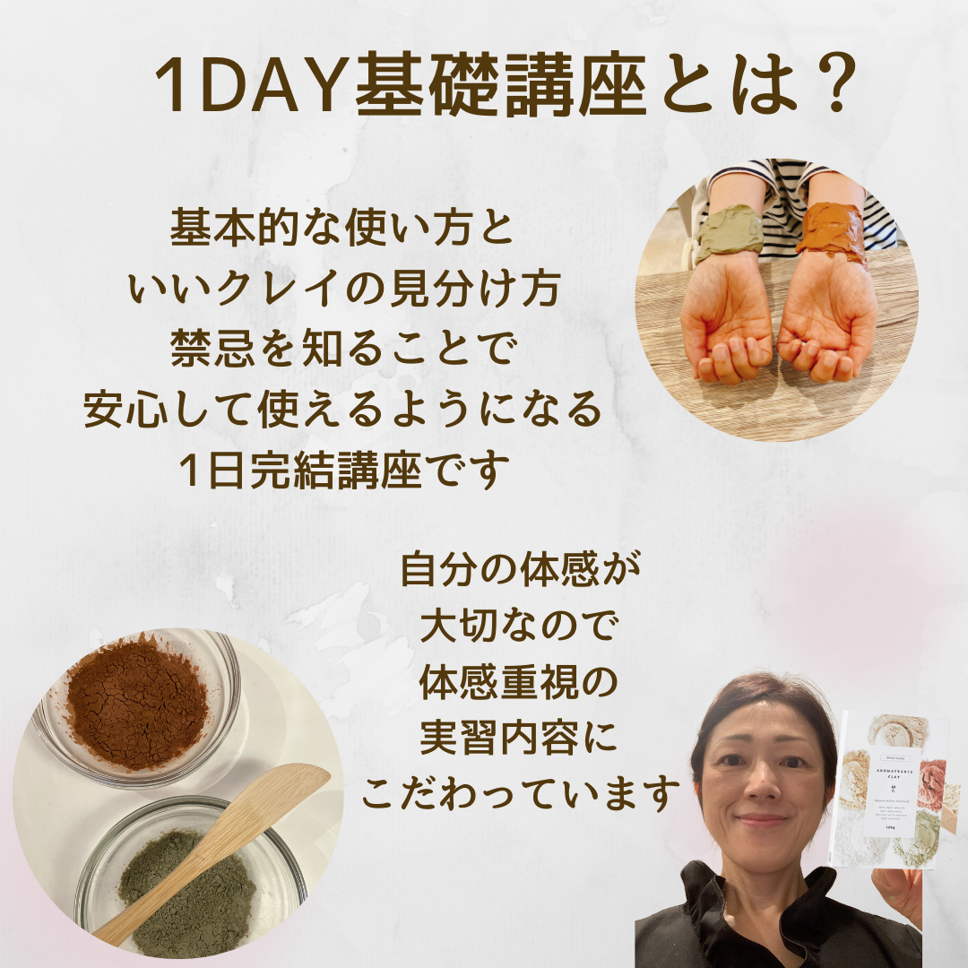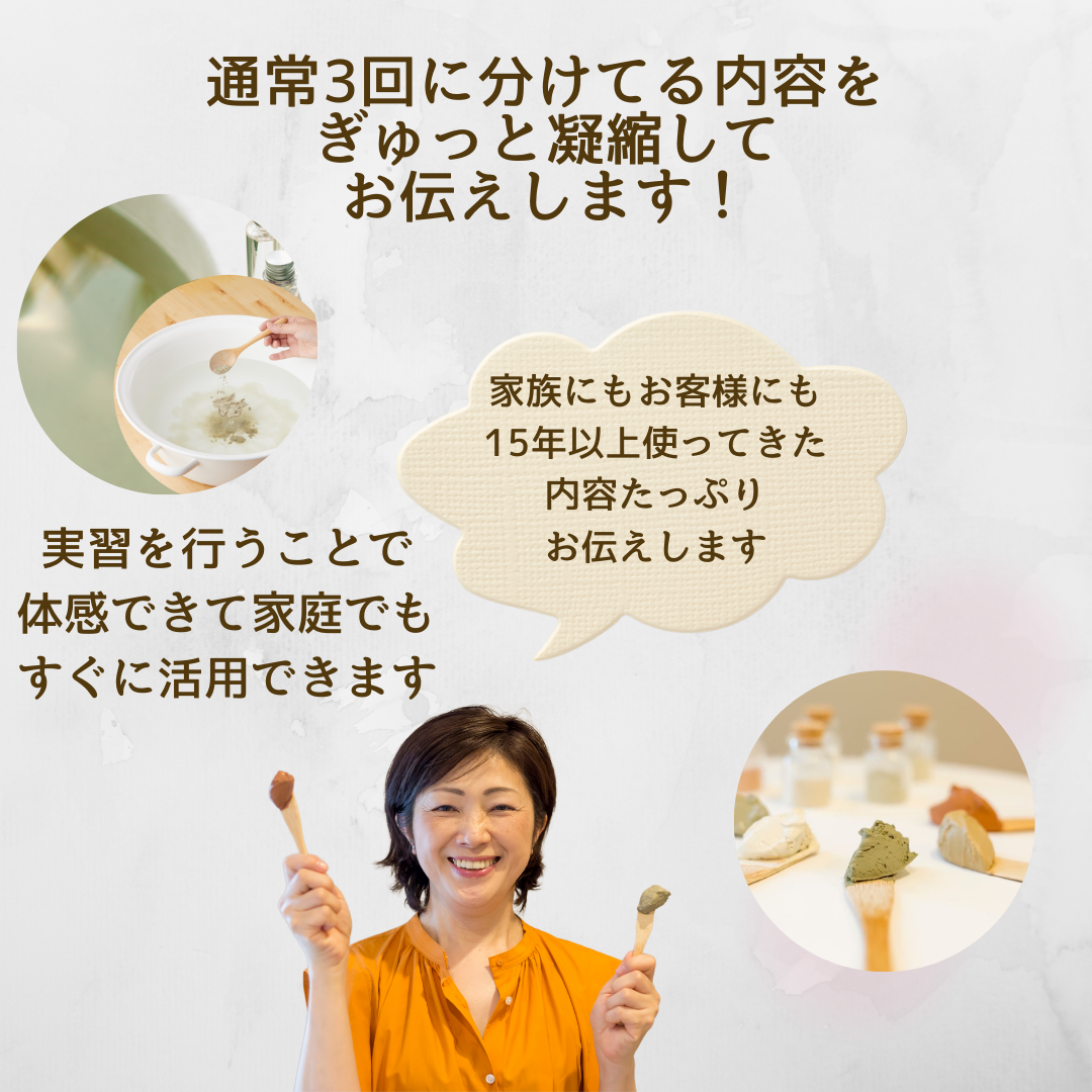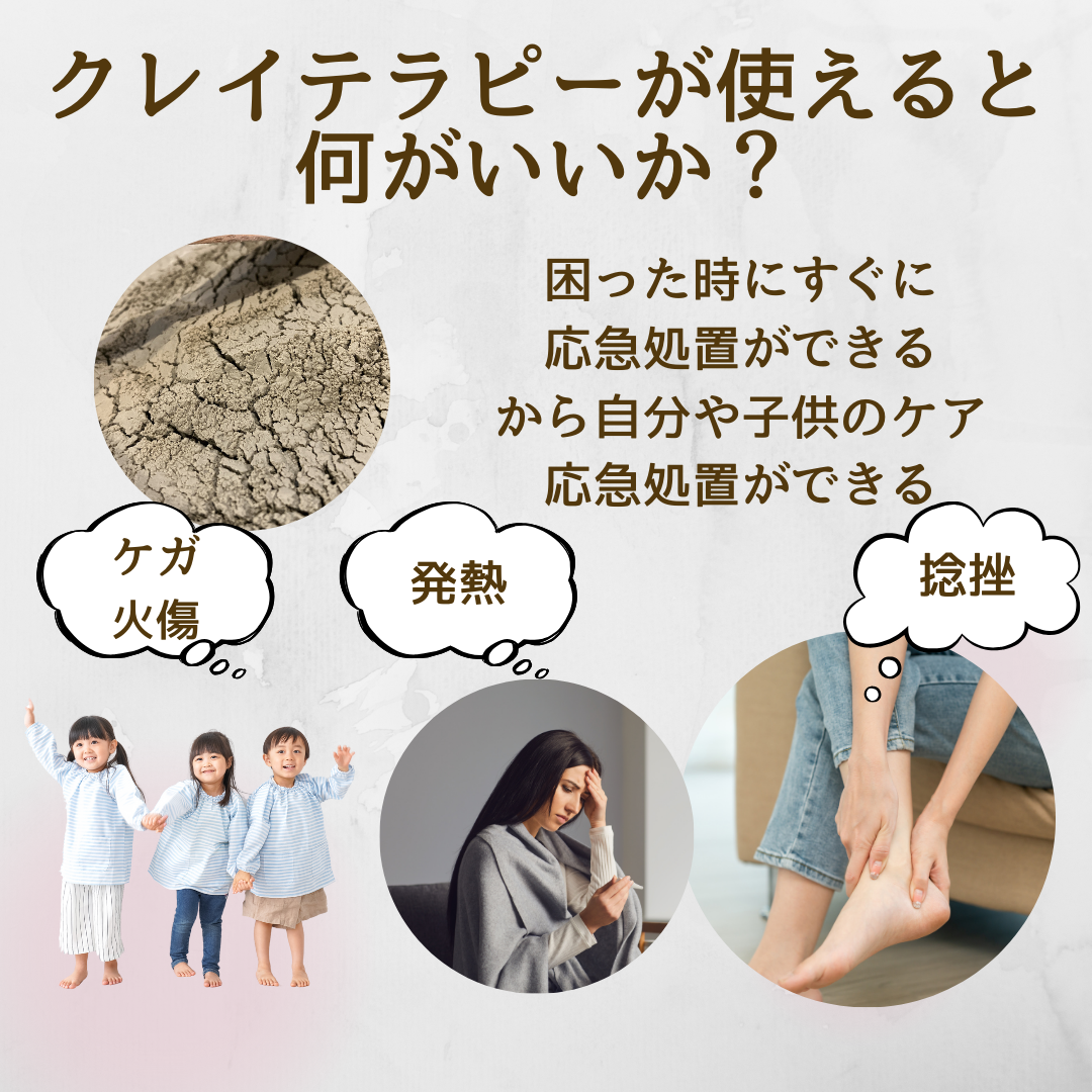 学ぶことで「クレイ」について役割が明確になり先ずはご自分や家族に使えるようになる講座です。
